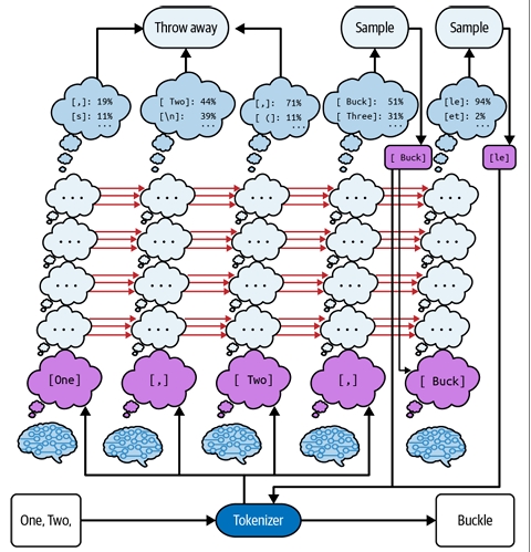 مدل، کل پرامپت شما رو میخونه و فقط یک توکن بعدی رو حدس میزنه. همین! بعد، این توکن جدید رو به انتهای پرامپت اضافه میکنه و دوباره کل متن جدید رو میخونه تا توکن بعدی رو حدس بزنه. این کار اونقدر تکرار میشه تا در نهایت یه جمله یا پاراگراف کامل ساخته بشه.